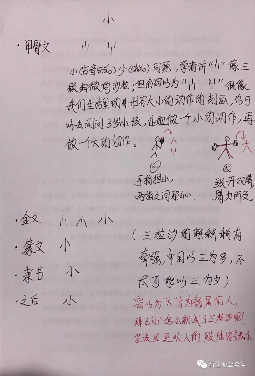 2.文汇·自华——小。小是最常用的形容词之一,也是甲骨文中最像现在文字的。但是古人造字时候是怎么定义小的呢?这其实一直是争论点。三粒沙算是小吗?或者三粒沙算就是少了吗?好像有点牵强附合。我问了一下我的女儿,小是什么样子的?她就捏着大拇指和食指,比划着说这么小。我突然茅塞顿开,古人可能也是由此得意,捏起手指产生小的具体形态。这不就是最简单的小或者少吗?