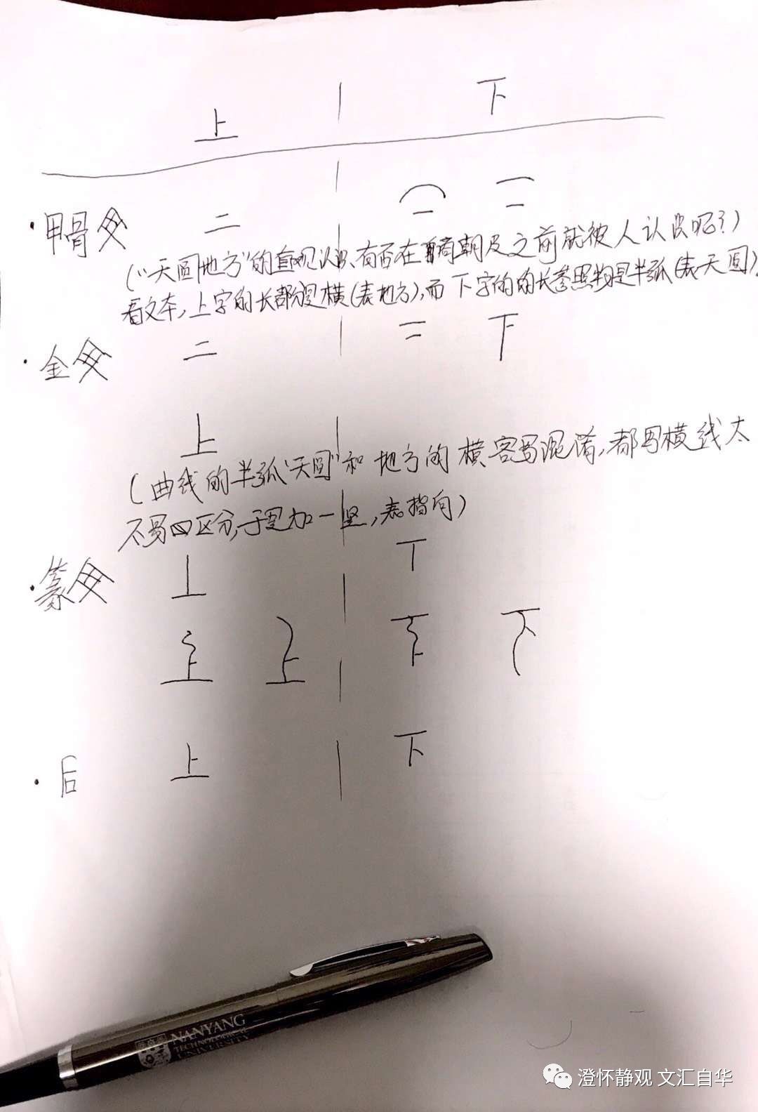 其次,到了金文时代,大家也发现参照物(长线)中的横线和曲线不容易标准化,就都写成横线了。但麻烦是容易混淆,所以为了更好的区分,加入了指示性的竖线,这样上下在应用层面算是真正的完成了符号区别。