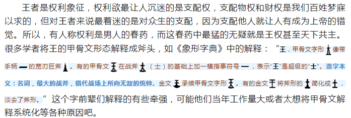 当然,现在很多人解释“王”这个字听起来也非常合理,说王字是一人通天地,三条横线代表着天地人,只有王者才能与天地人三圣沟通(老子曰,域中有三大,天大地大人亦大)。这个解释也非常通顺,适用于简体字,但稍有些脱离了甲骨文的本形。