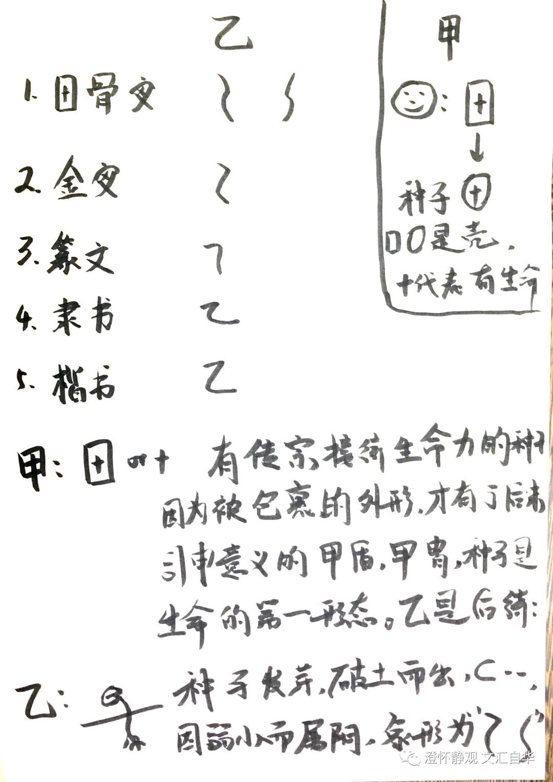 本文伊始,笔者先分享文汇自华33中对“甲”字的部分新思路:甲就是种子,因外有壳包裹所以甲骨文用“口”表示壳的保护,因内有生命力可以再次新生出生命所以甲骨文用“+”符号表示有新生的能力。所以,甲字就是一个种子(也可以理解为一个受精卵的蛋等,反正是可以做加法,产生新生命的),甲是万物之元始,后来古人因为外有壳保护的特性,才引申出了甲盾、甲胄等意义。进入正题,今天解“乙”: