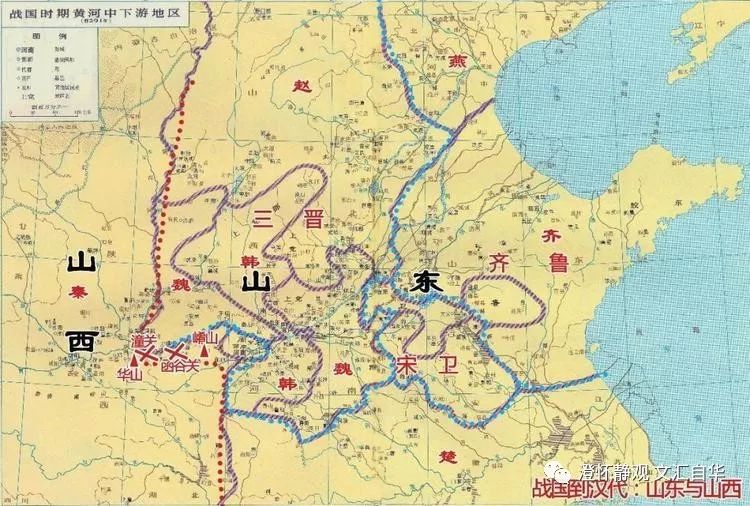 这个时候的山东指的是崤函之东的地方(崤函是指崤山和函谷关,相当今河南洛阳以西至潼关一带。西汉贾谊《过秦论》称“秦孝公据崤函之固”即此地)。崤函是秦国最东边的战略要塞,有“一夫当关,万夫莫开”之称,是中国古代兵家必争之地。先来看看战国时期的天下图谱: