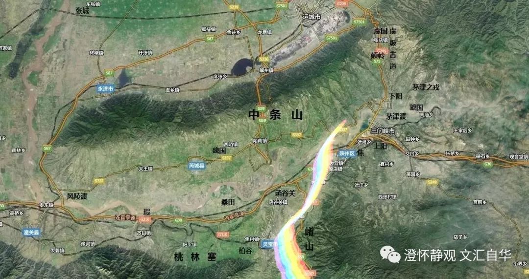 再来看下面的地势图中,崤函所在的位置(彩虹标记):易守难攻,冷兵器时代上佳的战略要塞位置。