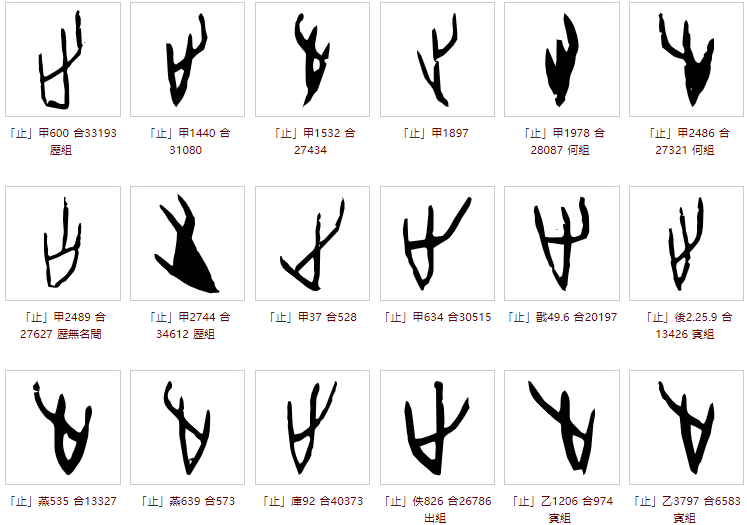 止的甲骨文基本分为两类,这类形如脚掌的剪影画,画中有足跟也有脚趾,但脚趾为三根,不知是以“三”指代多,还是其它特殊原因;这类为在基础上的抽象,由画到线描。部分甲骨文字形列举如下: