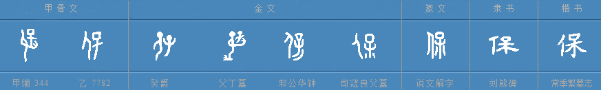 《说文解字》曰:“保,养也。从人,从省”,意为:保,养护孩子。字形采用“人”和省略了“爪”的“”会义。字形流变过程:
