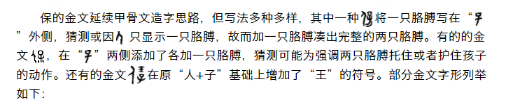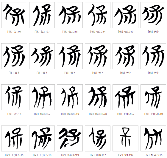 保的甲骨文基本为左右结构,由“人”+“子”两大要素构成,但组合方式多样,有的写法为人在左侧、子在右侧,有的写法为人在右侧、子在左侧,有的则为其他变化,那个时期的写法尚未标准化,故有多种字形。列举部分甲骨文字形如下: