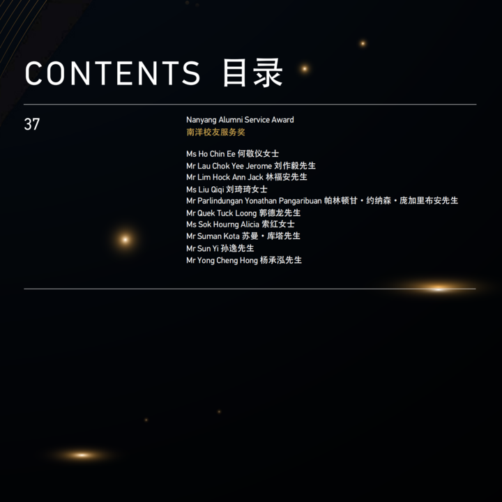 年度南洋校友奖创立于2005年,旨在表彰为新加坡南洋理工大学带来荣誉的校友,获奖者包括在各专业领域取得顶尖成就、享誉本国、本区域或国际社会的校友,或是曾对促进大学、社区或社会发展作出重大贡献的校友。