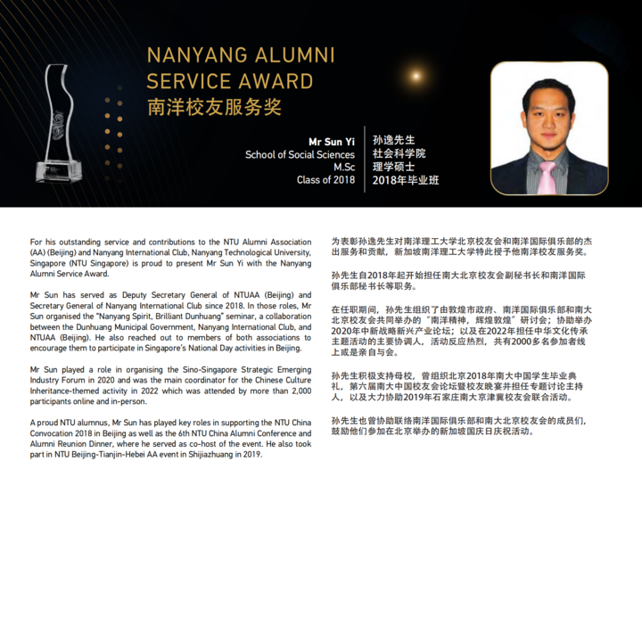 为了表彰孙逸校友对南大北京校友会和南大国际俱乐部付出的服务和贡献,南洋理工大学特此授予他南洋校友服务奖。
