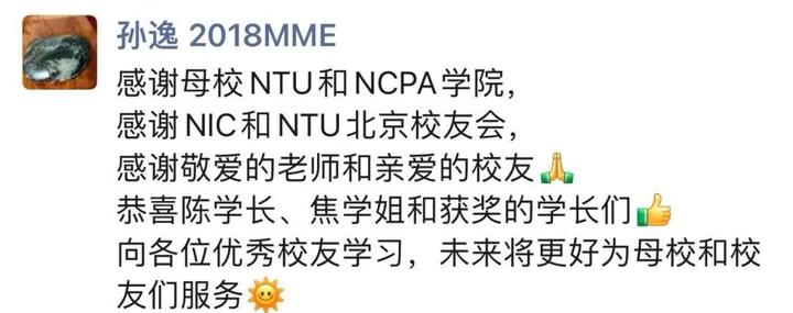 在颁奖后,孙逸校友也第一时间在朋友圈分享了喜讯,并对大学及南洋公共管理研究生院、北京校友会和南洋国际俱乐部表示感谢。