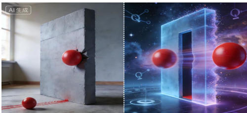 人向墙投掷小球,在宏观领域,如果扔一个乒乓球,那是不可能穿过墙体的,因为人提供的能量远远小于墙壁势垒的阻碍能量,这是我们的常识;但如果扔一个电子,那结果就完全不同了,人给电子提供的能量虽然比墙的势垒能量小得多,但是电子的波粒二象性决定了,它有概率能隧穿墙体。