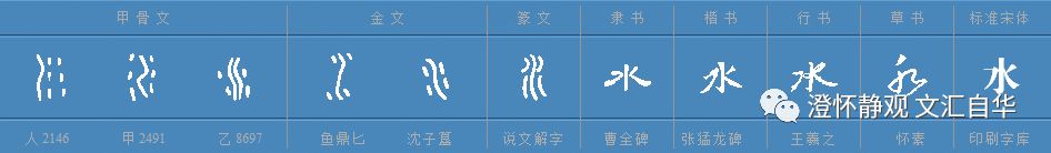 水这个字不算难理解,因为甲骨文时期的水字就比较容易从字形理解其含义。实线表示石壁等客观存在,那么虚线就代表水滴的形态,意思就是在石壁上飞溅起来的山泉(水滴)。本字没有太多难点,金文时期原来的三个或者两个水滴在一侧变成了统一都在一侧,而实线也变为了都在中间,这就和“离中虚坎中满”的八卦形态对应了起来,而且也已经和现在“水”字的结构比较相近了。