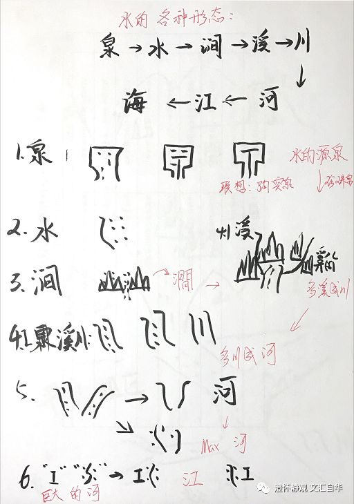 在造字时代,水流的源头叫“泉”;石壁上飞溅的山泉叫“水”;由山泉汇成的叫“涧”;山涧在地面汇成的清流叫“溪”;众多小溪汇成的水流叫“川” ;众多川流汇成的大川叫“河”,巨大的河的叫“江”,在后来有了海的概念。所以有海纳百川、名川大河、百川入海等词语。那么究极来讲,他们的形态虽然有了,但是动承转合的关系图谱是怎样的呢?如下图: