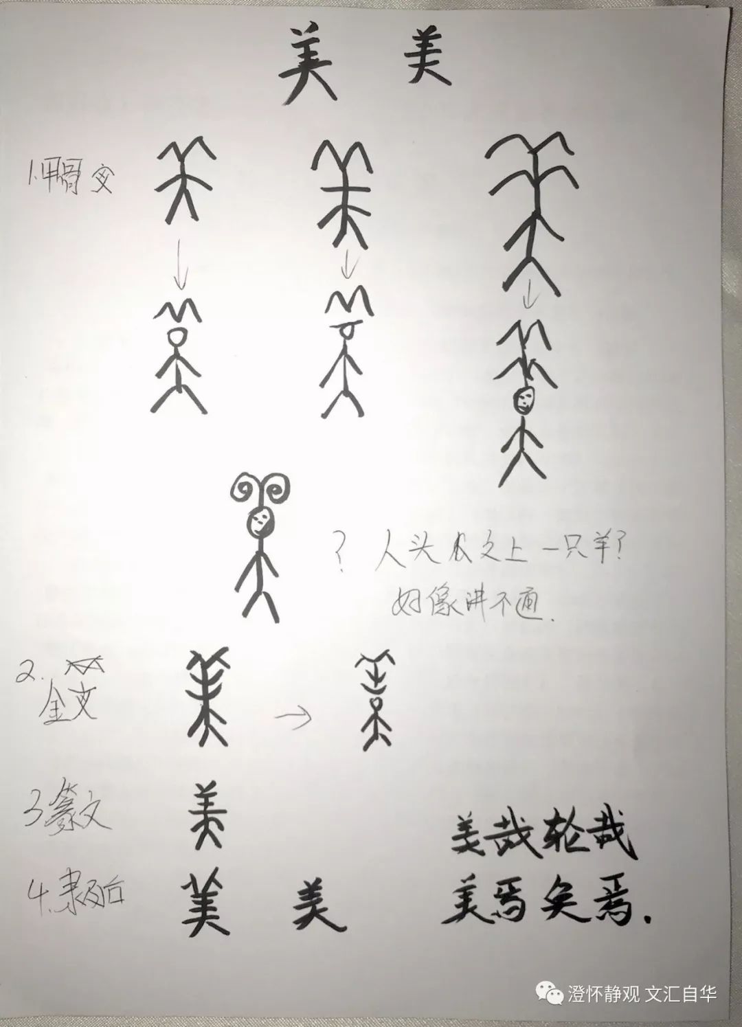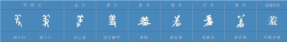 我比较同意上文作者的描述,“人”头上带的应该是装饰品,可能是花花草草之类的,或者是祭祀头戴的特殊含义的头饰,但应该不是羊头。许多学者解释为头上顶着羊头就是美,我认为不妥,首先羊头骨可以挂在家里,但是很少有人把它顶在头上,非洲也没有发现过这种行为。顶头上太重不说,而且不容易固定和移动等。还有学者认为是羊大为美,这句话说的可能没错,可能羊大了因为脂肪多而美味;也可能羊大了,其皮毛多了也美。羊作为人类最早驯养的温顺动物之一,因为其比较干净而又温顺,所以是祭祀的首选祭品之一。但是,羊大为美的话,“羞”“差”“盖”等的羊字旁的阐释就和本字有冲突啦。如下图: