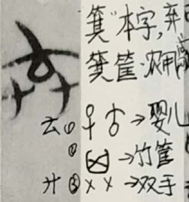 为双手。老子所处时代生产力水平不高,节育手段有限,有些百姓家养不起更多孩子,故会出现遗弃婴幼儿的现象(当时已出现重男轻女思想,故也伴随遗弃女婴现象)。金文时期字形承袭甲骨文构字思路,将被遗弃的对象具体指向婴儿,故将