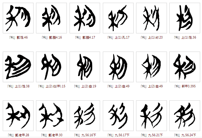 “利”字字形流变的过程中变化不大,时至今日亦是“禾”+“刂”的组合,代表以锋利之刀收割庄稼。字形流变过程:
