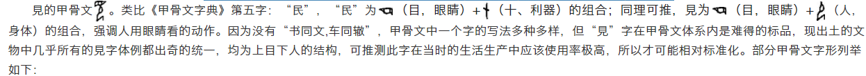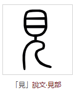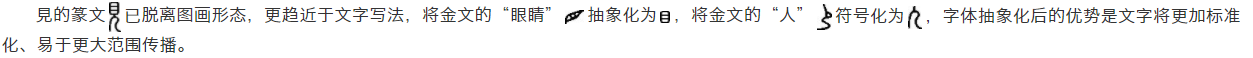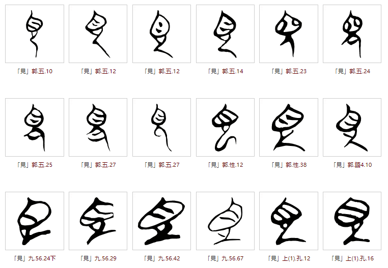 《说文解字》曰:“见,视也。从儿,从目”,意为:见,视,用眼看。字形采用“儿、目”会义。字形流变过程: