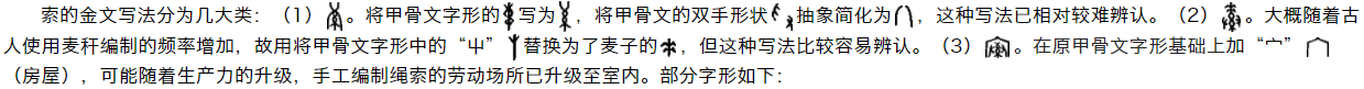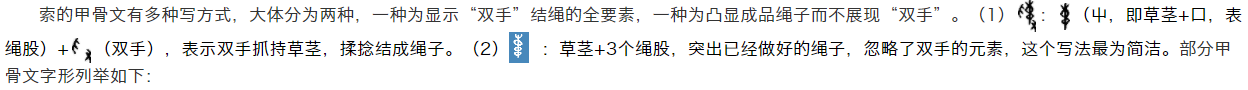 《说文解字》曰:“索,艸有茎叶,可作绳索”,意为“索,草有茎和叶,可用来制作绳索”。字形流变过程: