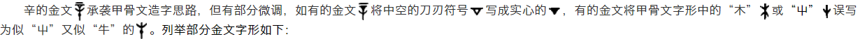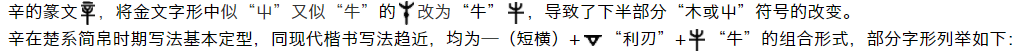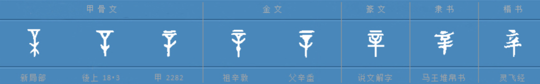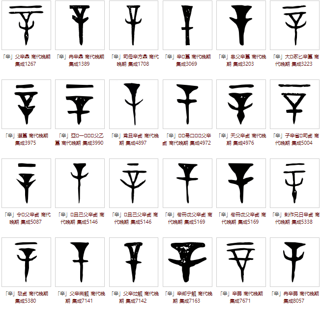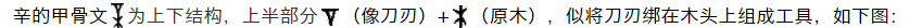 辛的甲骨文在学术界有多种解释,有学者解读为“用利刃劈砍木材”,但有个漏洞,即若为以利刃向下砍木材,那刃面应向下对准木材才符合逻辑,