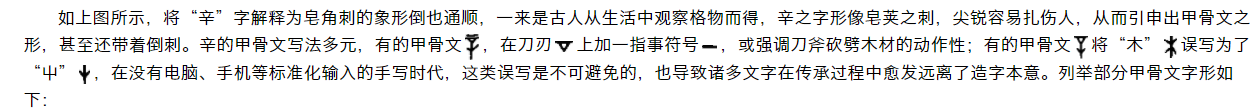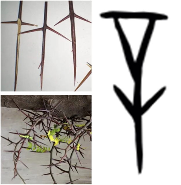 的方向应向下,而非向上;有学者解读为“锥子,大头呈三角形,中间有把手,小者用作刑具,大者用以劈木”,该解释讲得通;还有学者认为“天然而生的尖锐物体,皂荚之大刺、麦芒。古人受到天然尖锐物体的启发,发明类似工具。甲骨文画一个倒刺、上添一横表天然”,也讲得通。列举皂荚刺和辛字字形对比图: