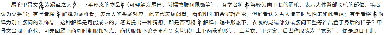 在跽坐的条件下,宽大裳衣的尾端(或系于腰间的玉佩、玉坠等饰品)难免会落在身体后侧,以此用来表示尾部则相对合情合理。我们通过妇好墓出土的商代玉坐人俑回顾下跽坐的形态,如下图: