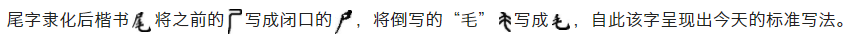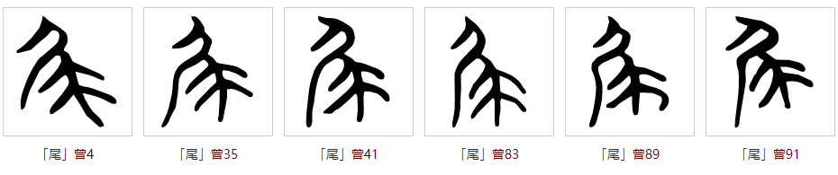 尾——有wěi、yǐ两读音,表尾巴、末端之意。读wěi时,做名词时,表尾部;亦表末尾、末端;边界、边境(如:夫边境者,国之尾也);二十八宿之一;姓氏等。做动词时,表尾随、盯梢;鸟兽虫鱼交配。做量词以代表金鱼的数量。读yǐ时通常做名词,表马尾巴或蟋蟀等昆虫尾部的针状物等。《说文解字》曰“尾,微也。从到毛在尸後。古人或飾系尾,西南夷亦然”;意即“尾,微小。字形采用尸和倒垂的毛会义,表示毛在尸后。古人有的在身后装饰着尾巴,今天的西南少数民族也这样。”
