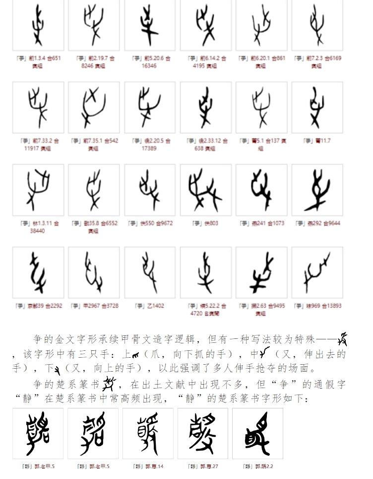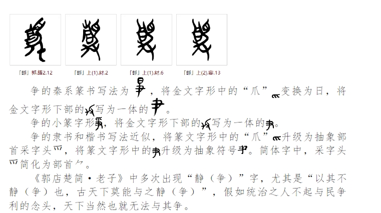 爭(争)——上“爪”(手),下“又”(手),中为某物,作动词时,表相互争夺争抢,如白居易的唐诗“几只早莺争暖树”;亦表示相差,如杜荀鹤的“百年身后一丘土,贫富高低争几多”;读zhèng时,表谏言,如《墨子·公输》曰“知而不争,不可谓忠”。做名词时,特指姓氏或春秋战国时期鲁国护城河的名字。做代词时,表怎么之意。