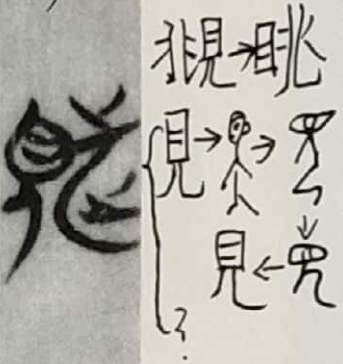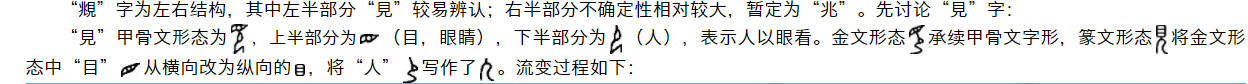 本字但暂以“”字定之。《説文解字》曰:“覜,諸矦三年大相聘曰頫。覜,視也。从見,兆聲”。即:诸侯每隔三年进行大型人才互访交流。覜,就是看。该字在此做何解,暂不确定,但应与“目”有关联。