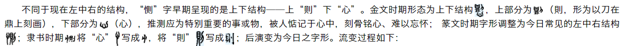 《説文解字》曰“惻,痛也。从心,则声。”学术界多将“恻”解释为“悲痛”之意,但是否只有悲痛让人刻骨铭心,难道快乐的事儿就不令人难忘?再或者,金玉满堂的宝物难道不让贪心之人心生惦记?故对“恻”字理解,暂无定论,只确定与“心”相关。