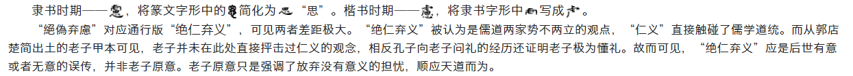 竹简现阶段最接近老子年代的出土物,开篇原文为“絕智弃卞,民利百伓。絕攷弃利,覜惻亡又。絕偽弃虑,民復季子。后出于便于学术推广等原因,有了“绝智弃辩,民利百倍。绝巧弃利,盗贼无有。绝伪弃虑,民复孝慈”等众多版本。郭店楚墓出土的竹简如是观照:
