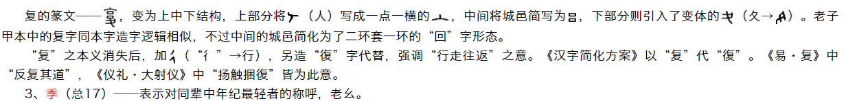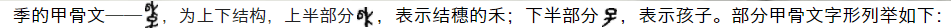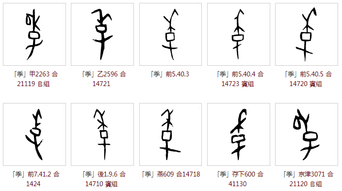 ,基本延续了甲骨文上下结构字形,但亦有左右结构形态(禾在座、子在右),不知是否以比禾苗还矮的孩子指代家中的老幺?“季”字中的禾苗一般为沉甸甸结穗的禾苗,穗内是种子,不知是否以种子表示最新最小的生命,以指代家中的老幺?还有学者推论,禾成熟于秋季,代表禾有最后一茬作物之意,“禾+子”也就代表了家中最后出生的孩子。众说纷纭,暂无最佳答案。部分金文字形列举如下: